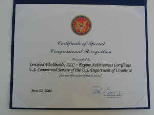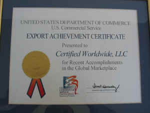 The "Export Achievement Certificate" was created by the U.S. Commercial Service of the United States Department of Commerce to recognize U.S. companies that successfully penetrate international markets for distribution of their product.